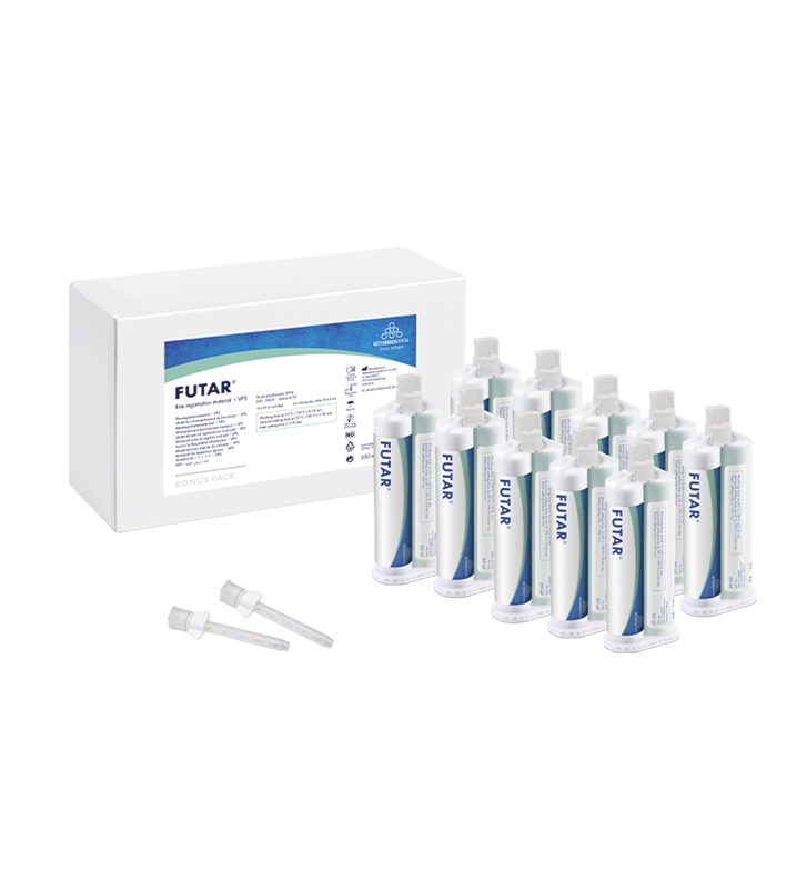Die Produktfamilie Futar umfasst sieben spritzbare elastomere Materialien für die Bissregistrierung zur exakten Aufzeichnung der Okklusionsverhältnisse. Alle Materialien sind A-Silikone und bestechen durch ihre hohe Endhärte und ein Höchstmaß an Komfort. Die Futar-Familie bietet für jeden Anspruch an Endhärte, Verarbeitungszeit und Komfort das passende Bissregistriermaterial.